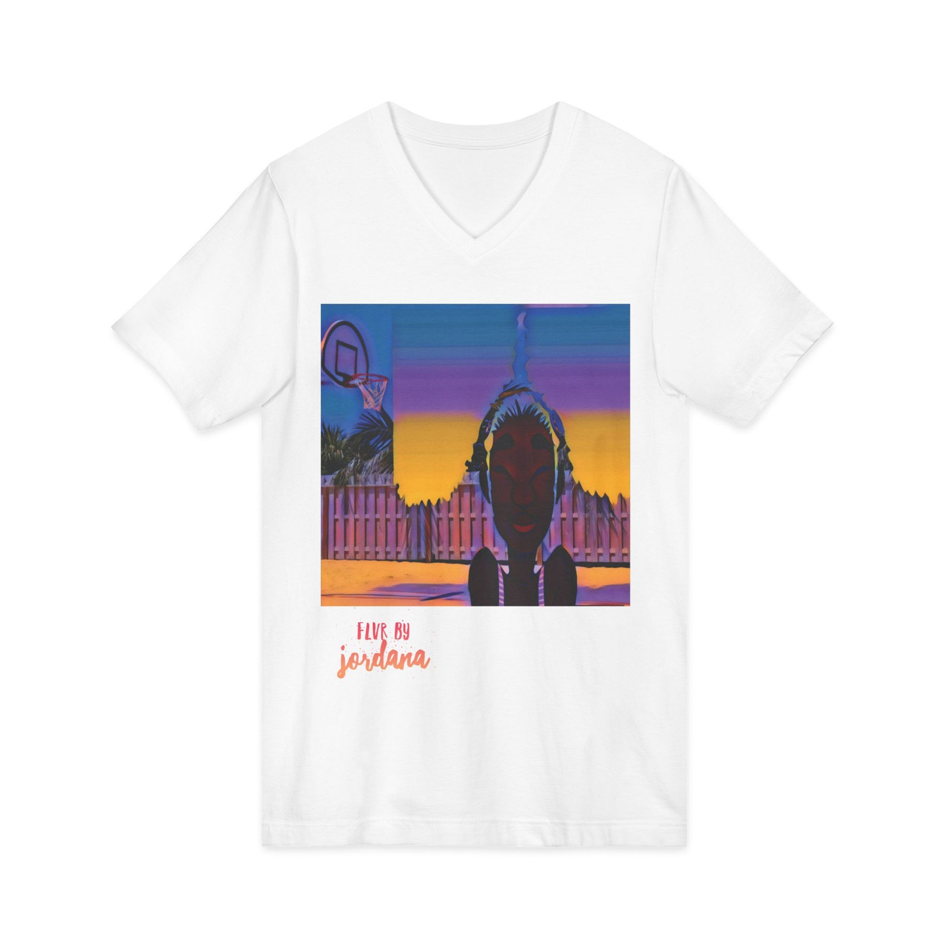 A lightweight V-neck tee that carries the mood of twilight streets and slow, thoughtful nights. The front print shows a silhouetted figure framed by a neon-hued sunset and an empty basketball hoop, evoking quiet evenings where the city hums low and memories feel close. Wear it when you want something effortless but expressive — a soft layer that moves with you and holds its shape, ready for late-night strolls, meetups with friends, or layering under a jacket for a show or gallery night. The slim retail fit and subtle V neckline keep the silhouette modern without shouting for attention. Ethically made and thoughtfully finished, this shirt feels as good as the story it hints at.